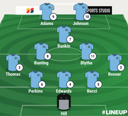 Line-up: Hill; Recci, Perkins, Edwards; Rosser, Thomas, Bunting (Holloway), Blythe, Rankin (Blake); Johnson, Adams (Marsden). Subs not used: Evans, Kavanagh. Booked: Edwards, Recci, Bunting, Johnson.
