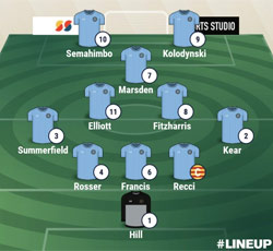 Valley Line-up: Hill; Rosser, Francis, Recci; Kear, Summerfield, Fitzharris, Elliott, Marsden (Lock); Semahimbo (Ahenkorah), Kolodynski. Subs not used: Thomas, Seymour, Whitehead, English. Booked: None.